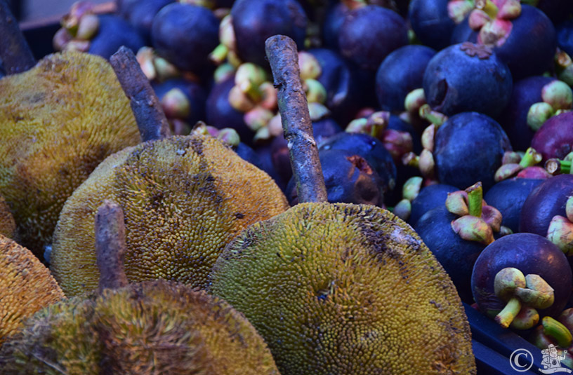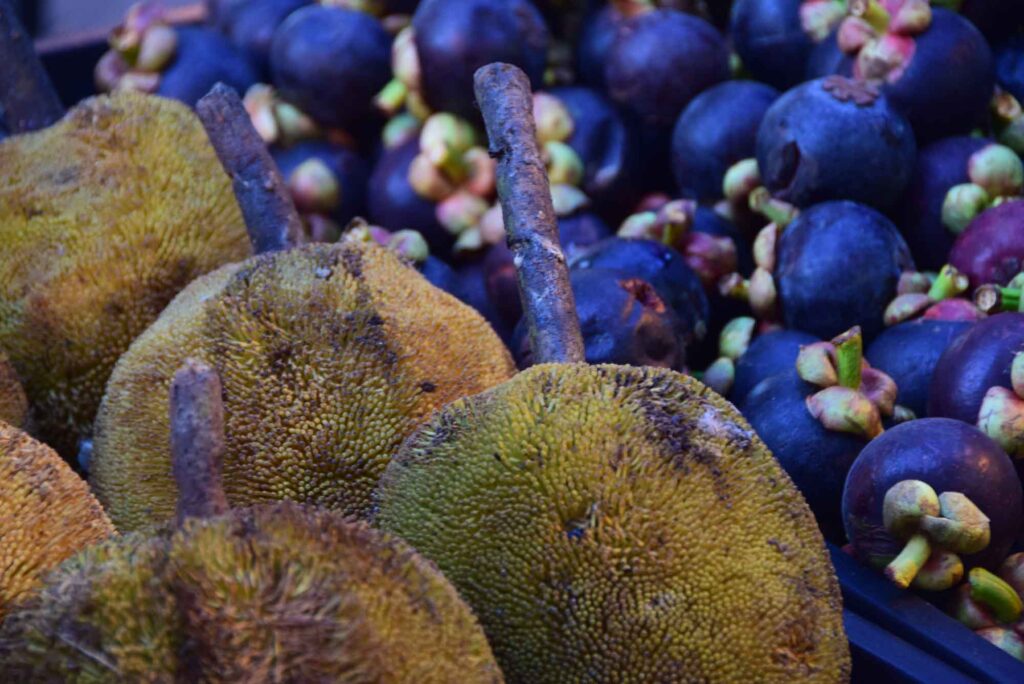 Jackfruit és lila maracuja, két nem őshonos gyümölcs Borneón – előbbi a jákafa termése, mely a legnagyobb fán termő gyümölcs a világon, súlya elérheti a harmincöt kilót.