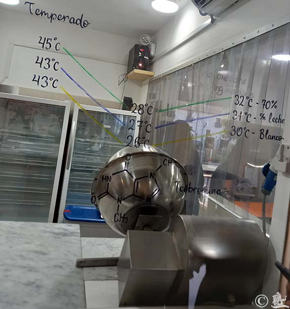 Csokigyár, temperáló. 70% = étcsoki, leche = tejcsoki, blanco = fehér csoki