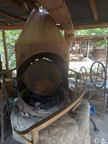 Ezután jön a pirítás. Kézműves, fatüzeléses pirítóval dolgoznak. Száznyolcvan fokra felhevítik, majd lecsökkentik száztíz körülire. Ezen a hőfokon pirítják a babokat harmincnyolc-negyven percen át. A fűtőanyag a champa fa. Pörkölésnek négy célja van: csökkenti a nedvességtartalmat a babban, fejleszti a kakaó aromáját, könnyebben hámozható babot eredményez és semlegessé teszi a kakaó savasságát.
