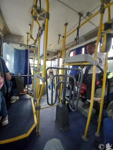 A buszok abból a szempontból különlegesek, hogy mindkét oldalon van ajtajuk. Ugyanis a megállók hol az út jobb szélén álldogálnak, hol az út közepén fekvő járdaszigeten. Érdekesek a buszba szerelt beléptetőkapuk, melyek érvényes bérlet hozzáérintése után engedik át az utasokat. A beléptetőkapu mögött kuporog a menetjegyet áruló kalauz. Mivel a papírjegyre nem reagál a kapu, a kalauz az, aki ez esetben működésbe hozza azt.