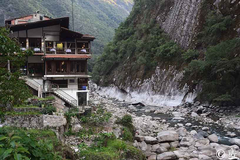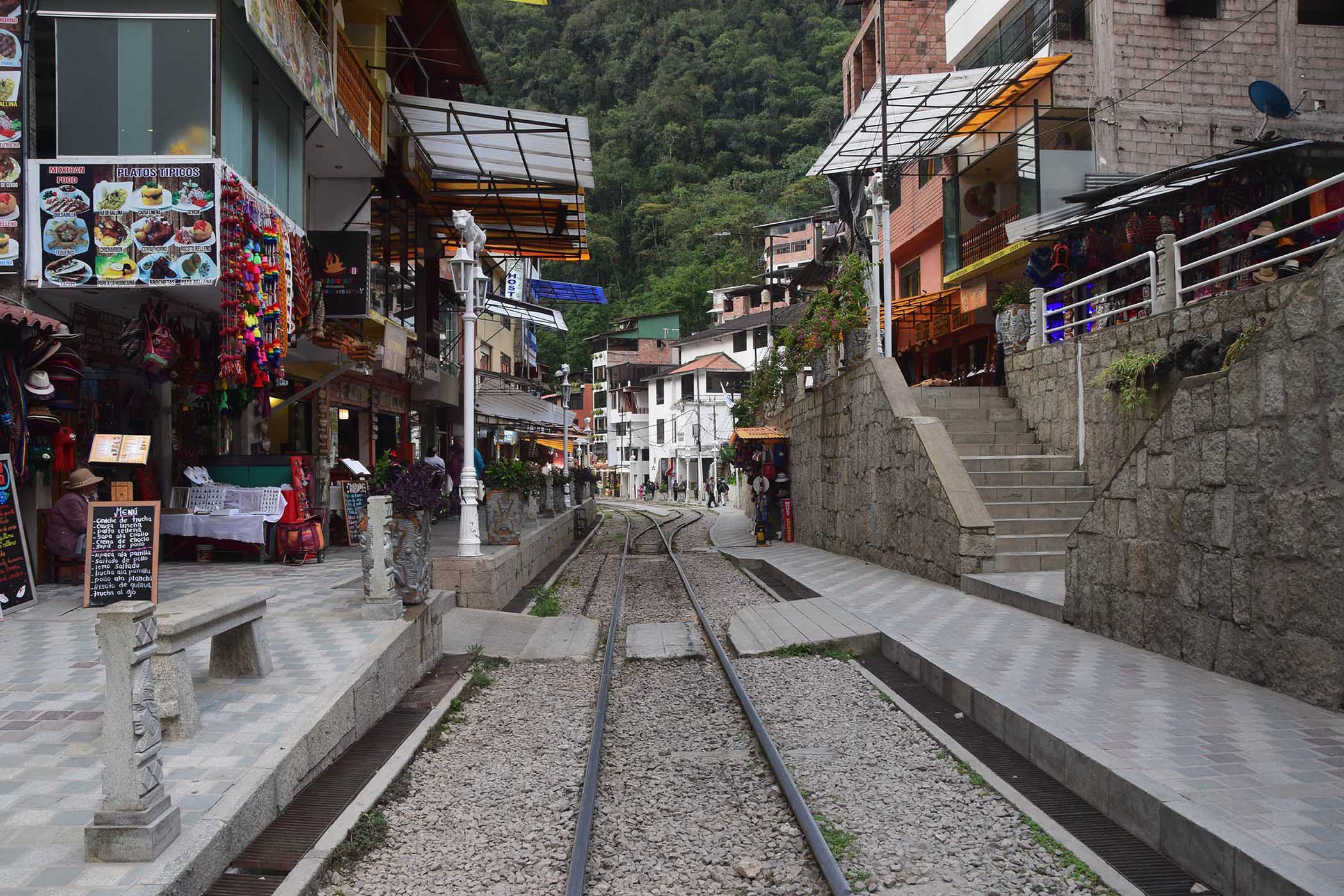 Aguas Calientes egy mély katlanban fekvő település az Urubamba folyó partján, többszáz méteres, függőleges, dús növényzetű hegyoldalak tövében. Autóforgalomtól elzárt település. Sikátorai kizárólag a gyalogosoké. Az inka romokhoz közlekedő buszok csak a falu elején vehetik fel az utasokat. Vasútállomása van viszont. A szurdokokon át, vonattal érkező árut talicskával vagy elektromotoros targoncákkal szállítják az üzletekhez, éttermekhez. Még a magasabban fekvőkhöz is. A házak között megbújik egy remek fekvésű focipálya.