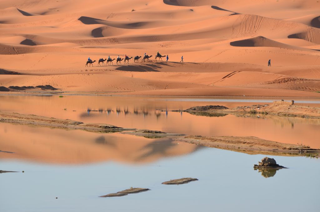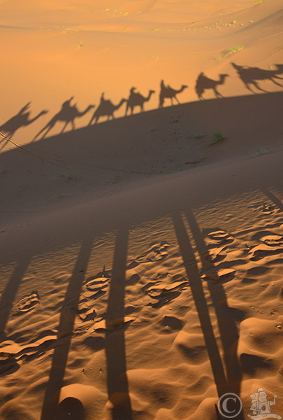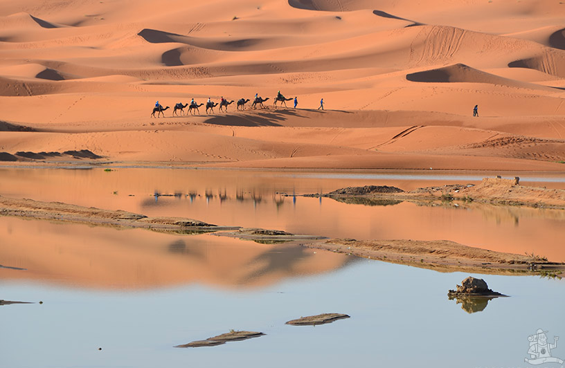 Erg Chebbi sivatag – hosszúlábú dromedárok