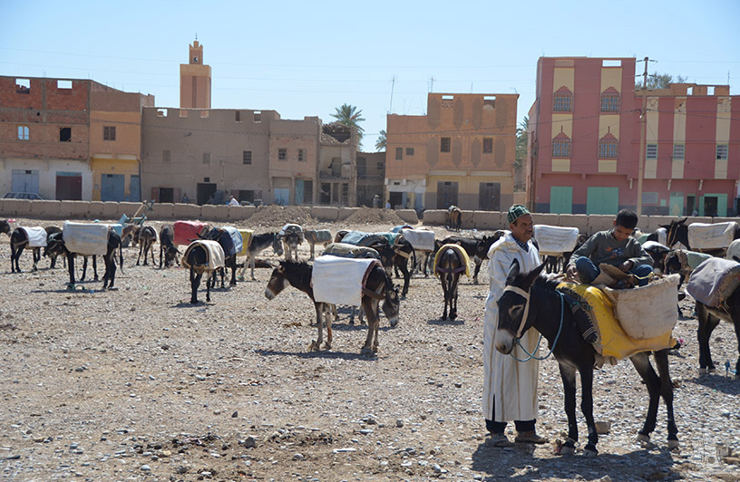 A fontos kereskedőutak találkozásánál kiépült, különösen bőrben utazó Rissaniban piaclátogatásra adtuk a fejünket. Ez a település arról nevezetes, hogy négy népnek is van piaca: tuareg, berber, beduin és nomád. A tuaregit lestük meg. Fűszerhegyek, hentes, ruha-, juh- és szamárvásár.