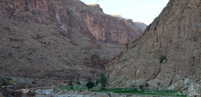 Estefelé felfedeztük a Todra-szurdokot. Pár száz méter erejéig utcaszélességűre szűkül a völgy, miközben óriási sziklafalak tornyosulnak a fejünk fölött. Egy-egy kisebb oázis színesíti az amúgy kietlen, csupasz tájat. Egy cirka négyszáz négyzetméteren még pálmafák is lengedeztek. Csillagunk közben lemenőben járt, de még megvilágította a kopár sziklák tetejét. Éjjel tevéket számlálgatva hunytam le a szemem.